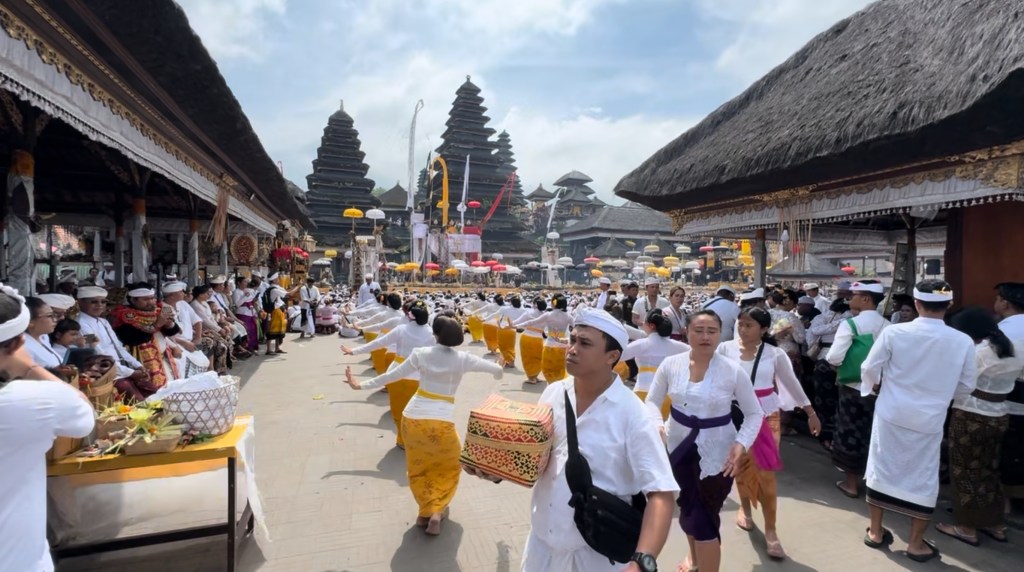 After meeting with our tour guide, an electric cart carried us up a steep incline to the temple’s base. As we slowly ascended once again, it was evident that the temple was a hub of activity, bustling with locals in their traditional white attire, sarongs, and the ceremonial rice pressed to their foreheads. Wearing the sarong and udeng for the first time felt slightly awkward, marking us clearly as novices amidst the sea of pristine white, but it was also thrilling to momentarily immerse ourselves in the local culture—even if our more vibrant attire gave us away as tourists instantly.